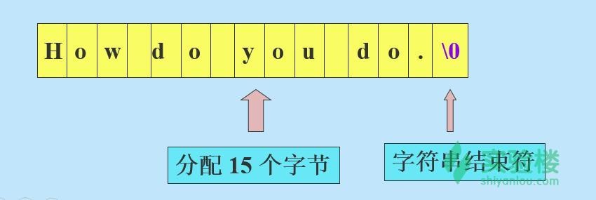 字符串常量是用一对双引号括起来的零个或多个字符组成的序列,如 “hello”,”China”,”b” 都是字符串常量。 字符串常量的存储与字符常量的存储是不同的。字符串中的每个字符占用一个字节,在存储字符串常量时还要自动在其末尾加上 ‘\0’ 作为字符串结束的标志。 “How do you do.” 存储示意如下。