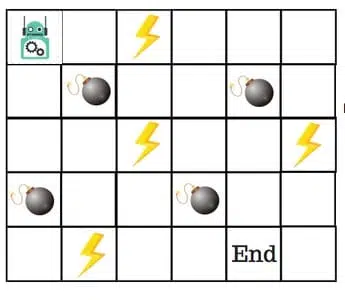 假设机器人必须越过迷宫并到达终点。有地雷,机器人一次只能移动一个地砖。如果机器人踏上矿井,机器人就死了。机器人必须在尽可能短的时间内到达终点。