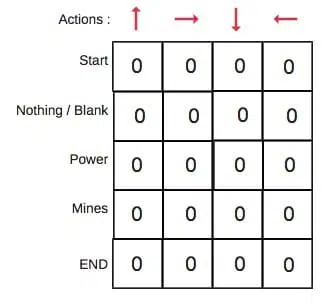 在我们的机器人示例中,我们有四个动作(a = 4)和五个状态(s = 5)。所以我们将构建一个包含四列五行的表。